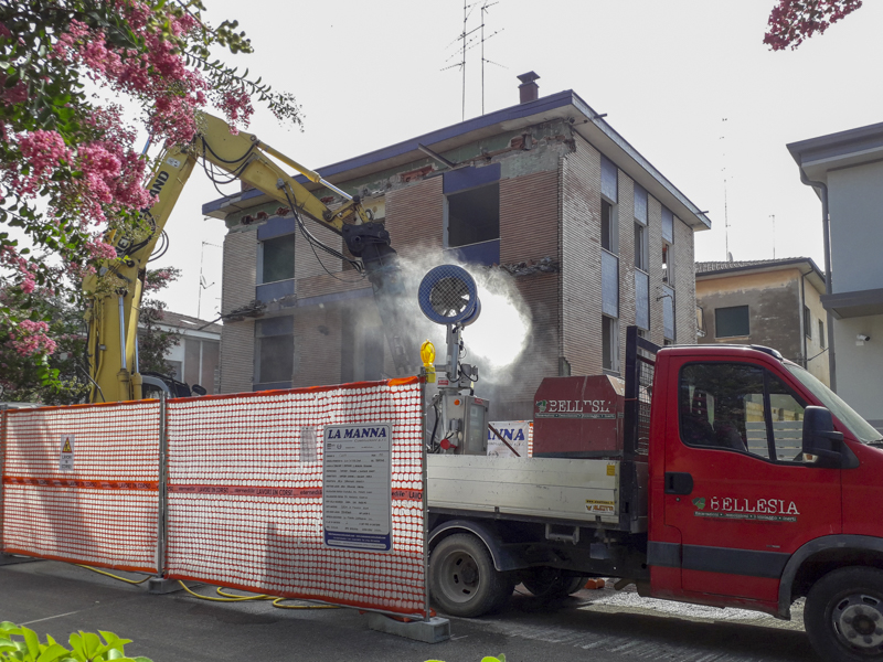 I sistemi di demolizione oggi sono molto avanzati e consentono di preservare gli edifici circostanti, di rispettare le normative sulla sicurezza degli operatori e dell’ambiente. Per l’abbattimento delle polveri impieghiamo cannoni nebulizzatori orientabili, con getto di 30 metri, emesso da 64 ugelli, per un’area di 1.850 mq. Le autobotti con idranti hanno getti che raggiungono altezze elevate.