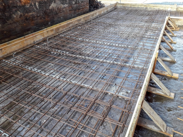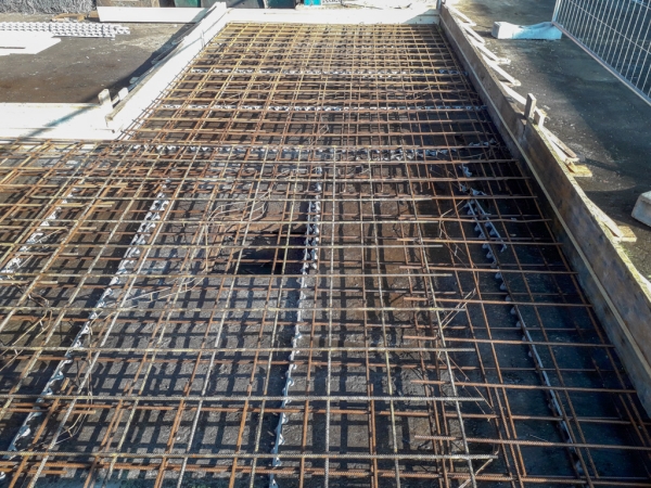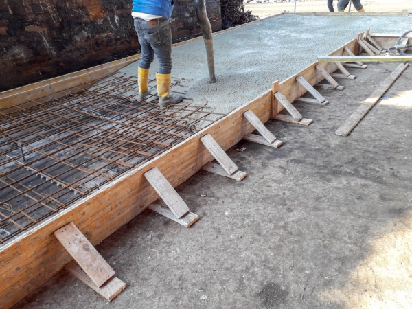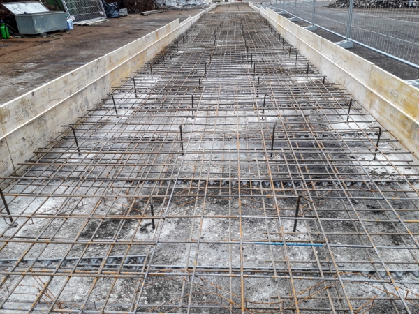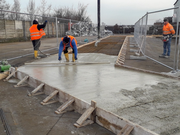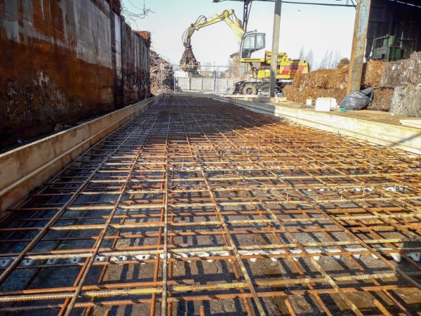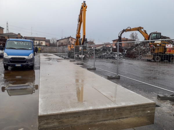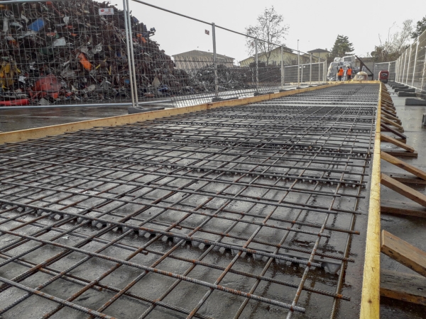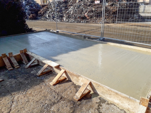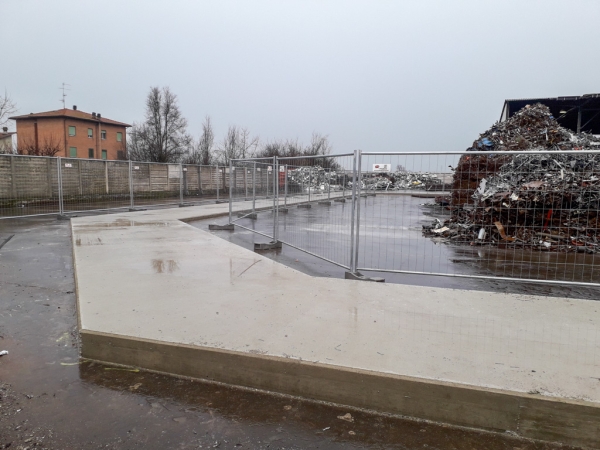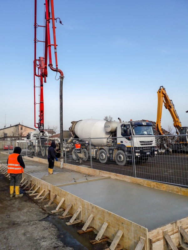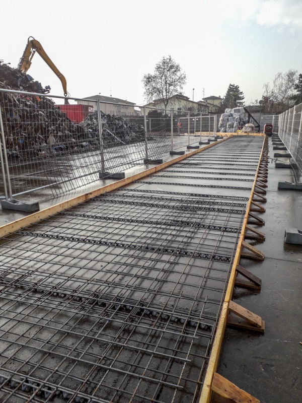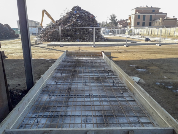 Dopo la costruzione e la posa del casserato e dell’armatura, abbiamo gettato e livellato il calcestruzzo. Abbiamo ben compattato il cemento per dare stabilità alla struttura che deve sopportare carichi molto importanti: moduli prefabbricati di 8 metri di altezza, dotati di pannelli fonoassorbenti in argilla espansa. Oltre ad aver abbattuto i rumori, l’area è stata così “recintata” e suddivisa in percorsi e zone più funzionali alle attività.