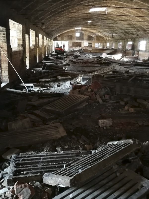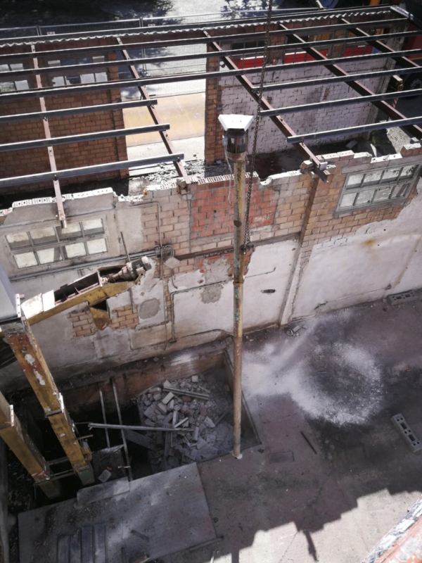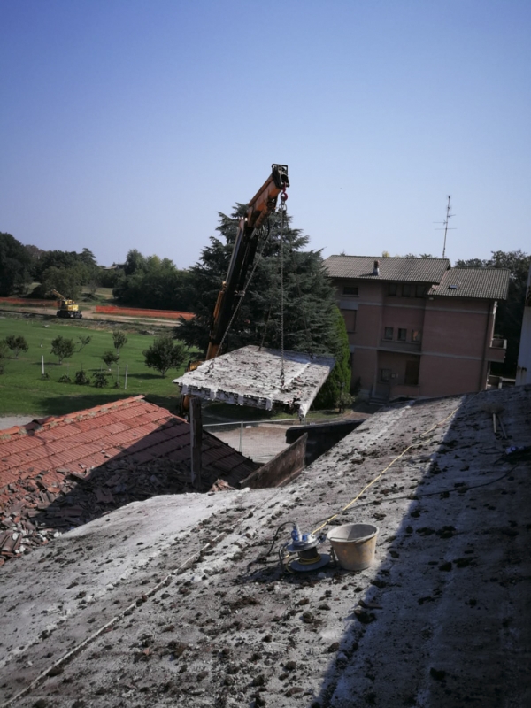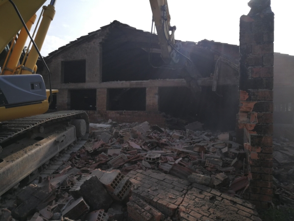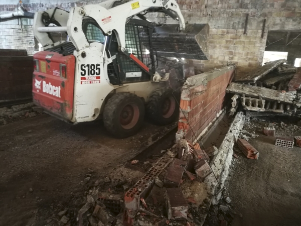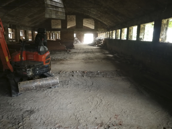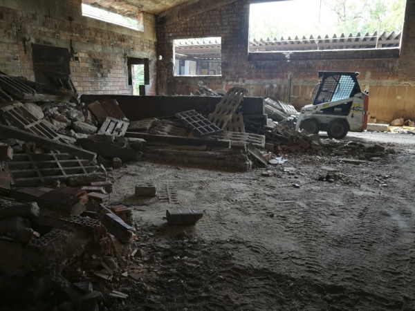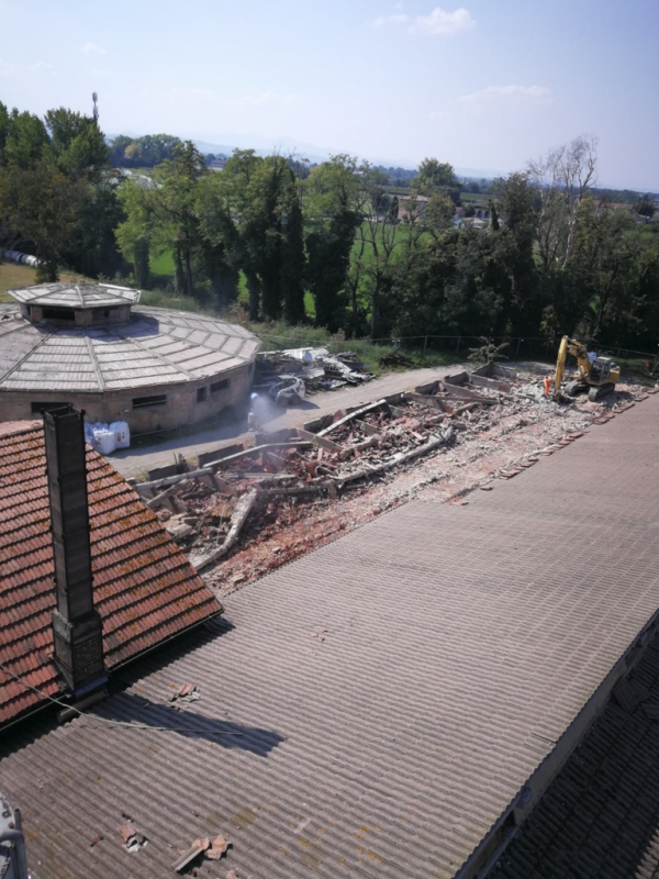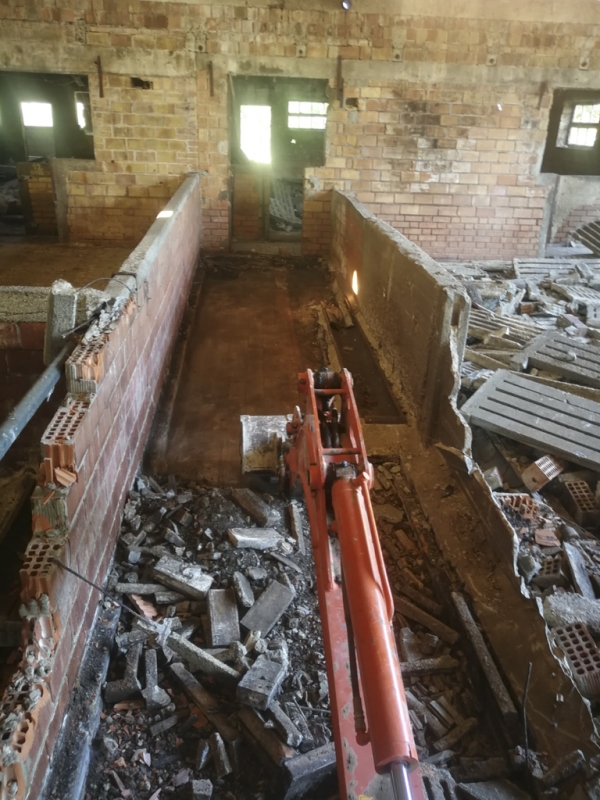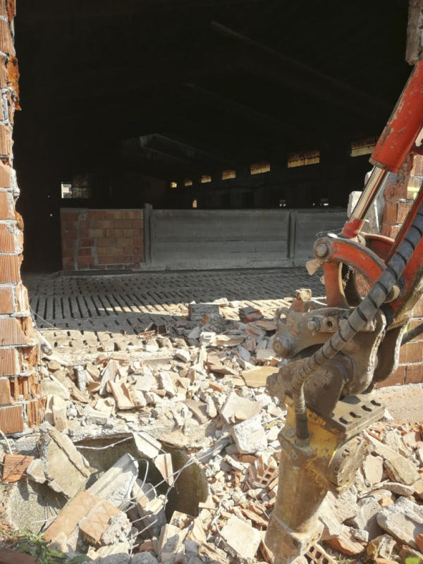 Questa demolizione ha interessato una volumetria di 10.000 mc ed è stata preceduta dalla rimozione della copertura in lastre di amianto e da alcuni trattamenti di pulizia preliminari che sono durati una settimana. Le griglie in cemento armato per la veicolazione delle deiezioni sono state trattate dalla ditta autorizzata, solo dopo sono state rimosse e movimentate dalla nostra squadra. Col Bobcat, il mini escavatore e con interventi anche manuali, abbiamo liberato e asportato i grigliati per permettere la pulizia dei materiali rimanenti all’interno delle poste dei maiali, abbiamo demolito tutte le divisorie interne fungenti da recinzione, le coperture e infine i muri perimetrali delle tre porcilaie. Gli strati in lana di roccia delle coperture sono stati rimossi e collocati in appositi sacchi da conferire in un centro di recupero specializzato.