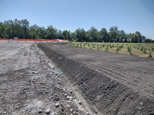 Piazzali di queste dimensioni, anche se permeabili e dotati di pendenze e teli sottostanti, devono sempre prevedere un sistema di convogliamento e scolo delle acque meteoriche. Per questo motivo la Direzione Lavori ha previsto la realizzazione di un canale che porti le acque verso un altro canale esterno, già esistente, di proprietà della Bonifica.