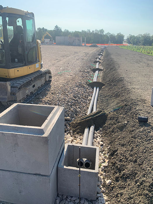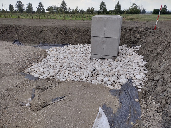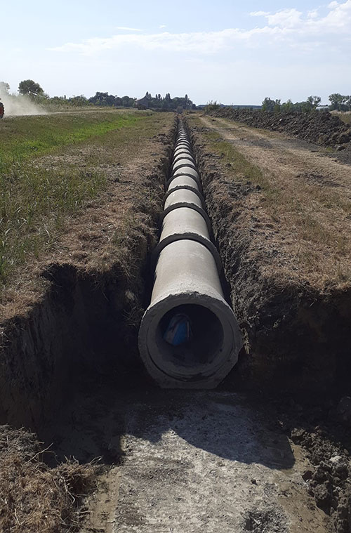 Per il nuovo canale tombato abbiamo realizzato lo scavo a sezione obbligata, abbiamo posato i tubi prefabbricati autoportanti che poi abbiamo ricoperto. All’interno del piazzale abbiamo posato anche un pozzetto di drenaggio con relativo vespaio che con una pompa sommersa rilancia le acque piovane all’interno dei canali esistenti.