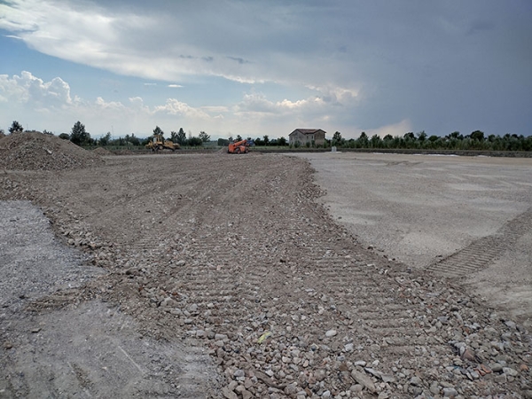 Gli scavi iniziali hanno interessato il vecchio piazzale che abbiamo risanato. Abbiamo rimosso la ghiaia superficiale e il terreno di fondo per ottenere le quote di progetto. Dopo gli sbancamenti abbiamo posato il tessuto non tessuto e steso il riciclato misto, su tutta l’area.