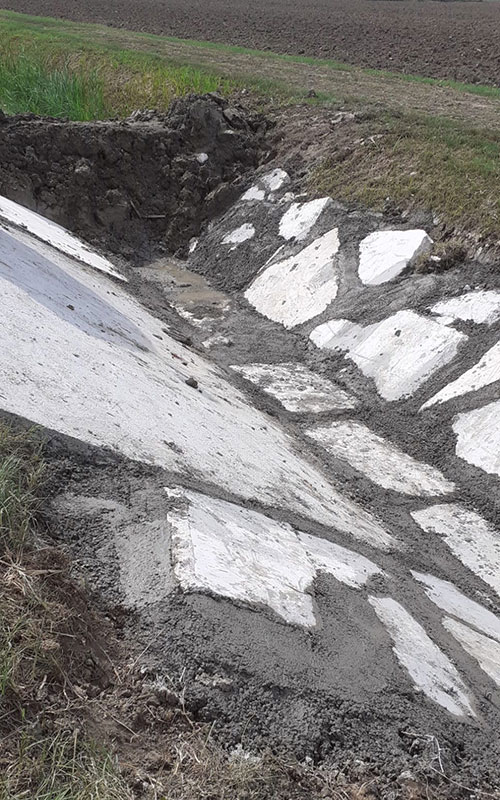 Infine abbiamo soddisfatto la richiesta della Bonifica, realizzando un manufatto in cemento armato laddove il canale tombato s’immette nell’altro. Per proteggere la zona d’immissione abbiamo rivestito il fondo e le due sponde con massi ciclopici.