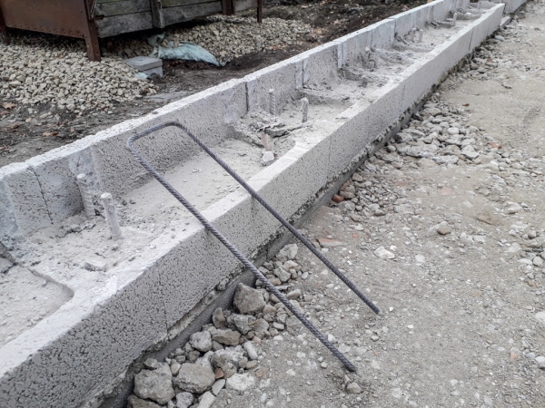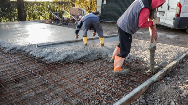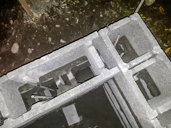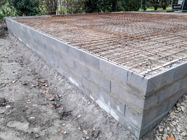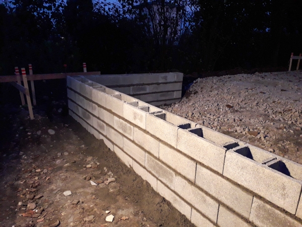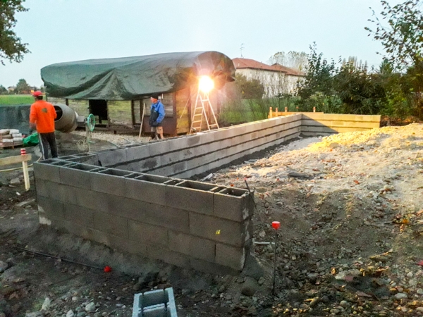 Dopo i plinti abbiamo costruito i muri di contenimento del rialzo con blocchi cassero riempiti di cemento e ferro. Abbiamo realizzato la rampa di accesso e preparato il fondo per la gettata del calcestruzzo. Una volta maturata è iniziata la costruzione dei garage. L’intervento è durato complessivamente 21 giorni.
