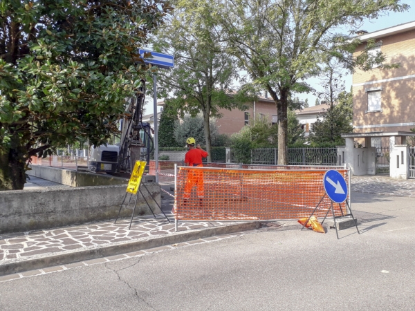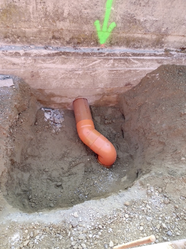 In quartiere Due ponti, uno di questi marciapiedi, costruito quarant’anni fa, ha iniziato a cedere a causa del sottofondo dilavato dalle piogge. Abbiamo iniziato così la demolizione della pavimentazione che era rimasta intatta e abbiamo individuato i collegamenti fognari sottostanti. Per la linea fognaria pubblica è intervenuta Aimag, mentre la nostra squadra ha rifatto i collegamenti per la linea fognaria privata, il cui passaggio si trova nel muro perimetrale dell’interrato del condominio (foto con sifone). Ora le acque meteoriche, dai piazzali dell’edificio, si riversano nella rete privata e da qui, dopo il nostro intervento, di nuovo nella linea fognaria principale.
