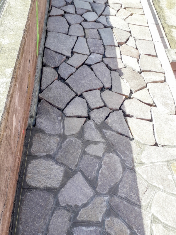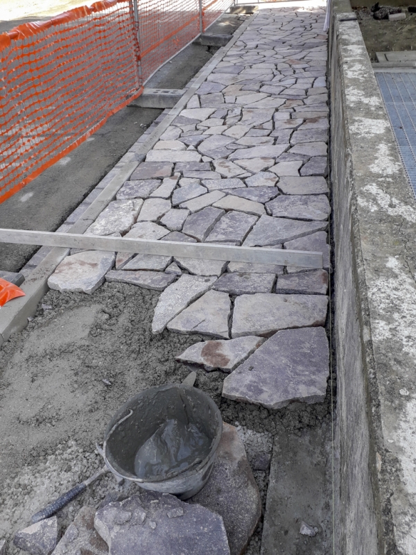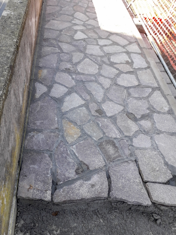 La DL ha richiesto che il nuovo marciapiede venisse armato e sostenuto con dei connettori attaccati al muro perimetrale del condominio. Abbiamo posato i cordoli, fatta la gettata e posato le lastre di porfido, infine abbiamo riempito le fughe con la malta e il marciapiede è stato finalmente rifatto, pronto per ridiventare teatro di gioco per i bambini.