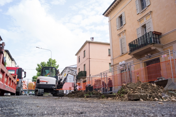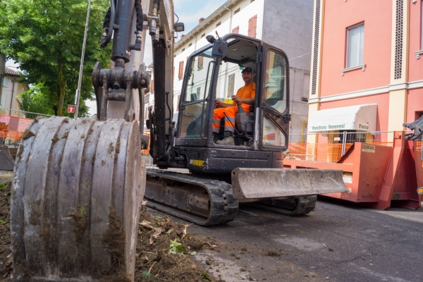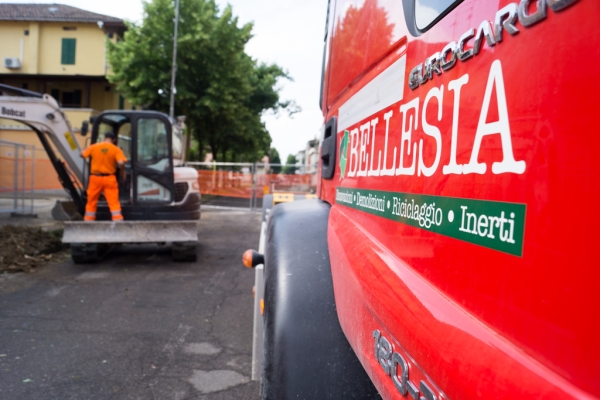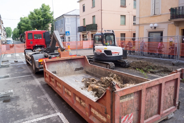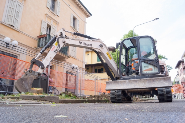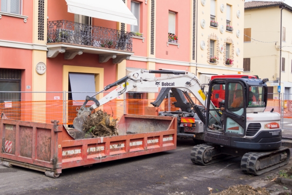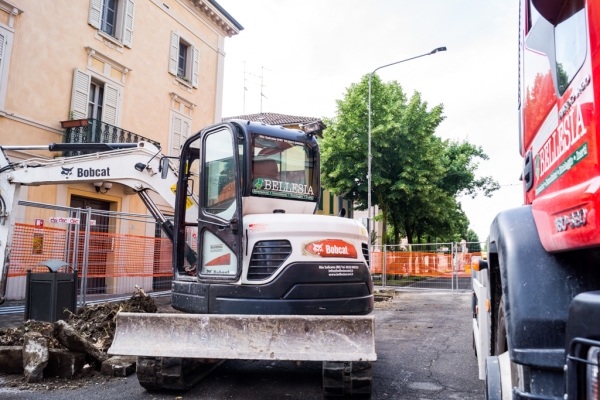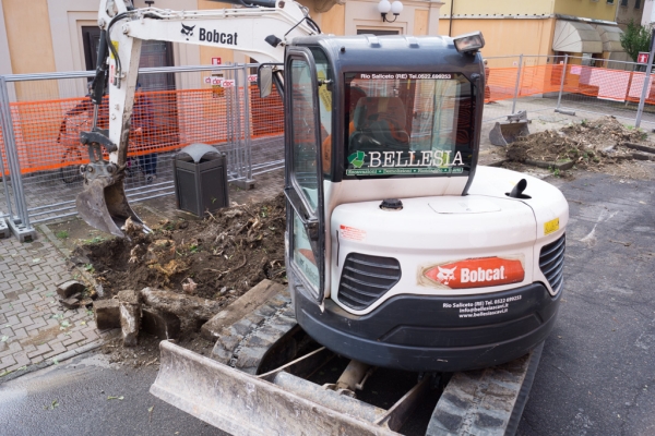 Dopo aver rimosso i materiali di superficie, i ceppi delle piante abbattute e tutte le barriere architettoniche, Bellesia movimenterà inerti per creare una pavimentazione continua tra la strada e l’area pedonale. È l’occasione per controllare il sistema fognario sottostante e l’eventuale impiantistica. Successivamente realizzeremo i piani per la posa della nuova pavimentazione con un massetto armato nell’area soggetta al traffico. Pubblicheremo altre foto con le diverse fasi dell’intervento che terminerà tra circa un mese.
