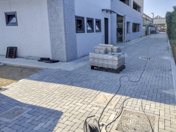 Per rispettare la normativa che regola l’indice di permeabilità delle superfici, col tecnico incaricato abbiamo deciso di rimuovere un “corridoio” di cemento dalla vecchia area cortiliva, per sostituirlo con l’autobloccante drenante. Abbiamo creato così continuità con la nuova pavimentazione e il parcheggio per i dipendenti che prima non era segnato.