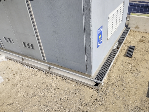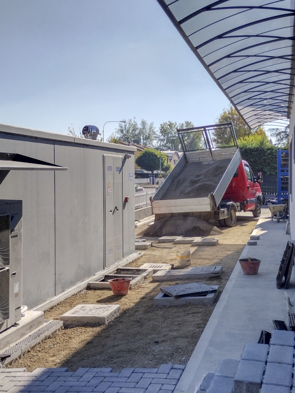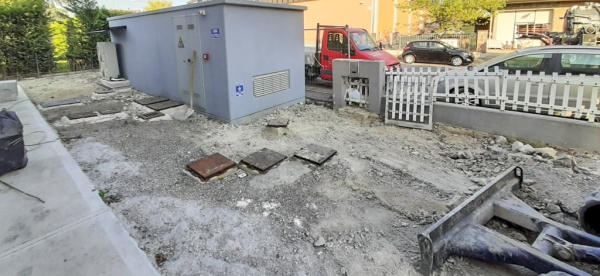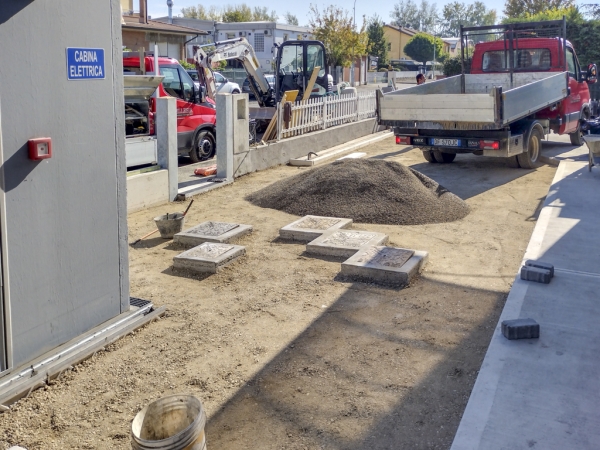 La nuova cabina elettrica ha ostruito il precedente ingresso, si è reso così necessario lo spostamento del cancello pedonale di qualche metro, mentre la cabina elettrica è stata ultimata con le dovute caditoie perimetrali per la raccolta dell’acqua piovana.