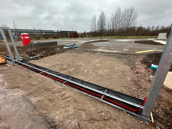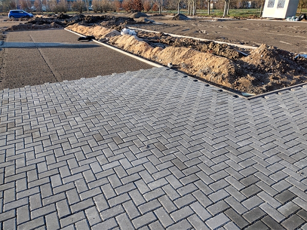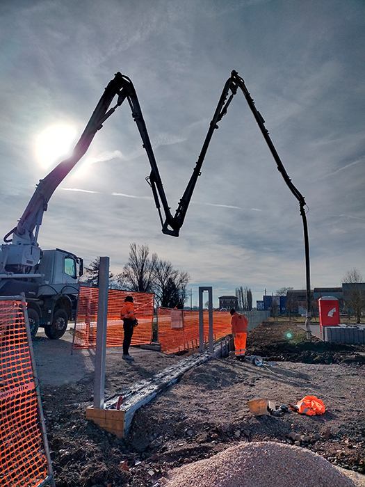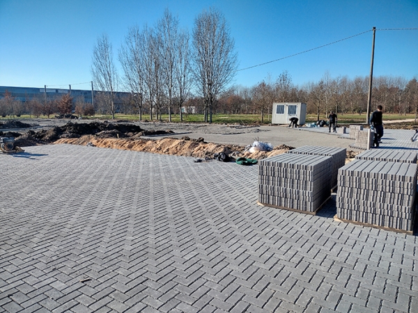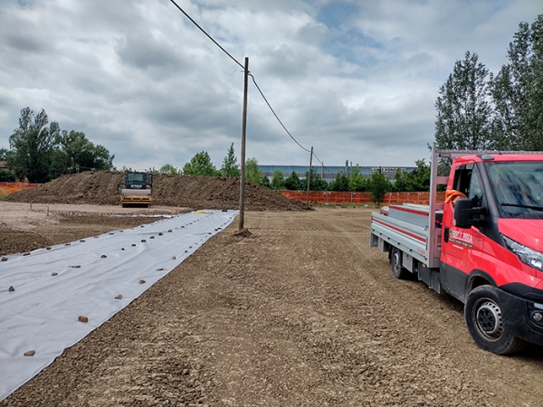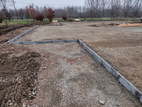 Con l’escavatore dotato di sistema GPS abbiamo realizzato gli scavi, steso il geo-tessuto e successivamente il riciclato misto. Dopo la posa dei cordoli sul perimetro e intorno alle aiuole, abbiamo messo in opera la trave armata dotata di guida per il cancello d’ingresso. Di notte, infatti, gli accessi al parco verranno chiusi. Infine abbiamo posato l’autobloccante sui 3.000 mq di superficie.
