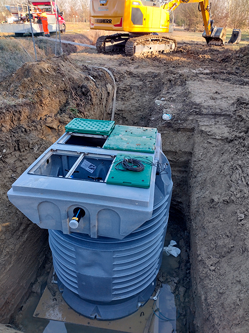 Per allacciare la nuova linea fognaria a quella pubblica, abbiamo installato un impianto di sollevamento che porta la tubatura nuova, in pendenza, dagli 1,5 m di profondità finali agli 0,30 m necessari. Tornato a tale quota, lo scavo è proseguito attraversando via Bersana con un tubo a pressione. Infine, dopo altri 130 m, abbiamo fatto l’allacciamento alla rete fognaria di via Meloni.