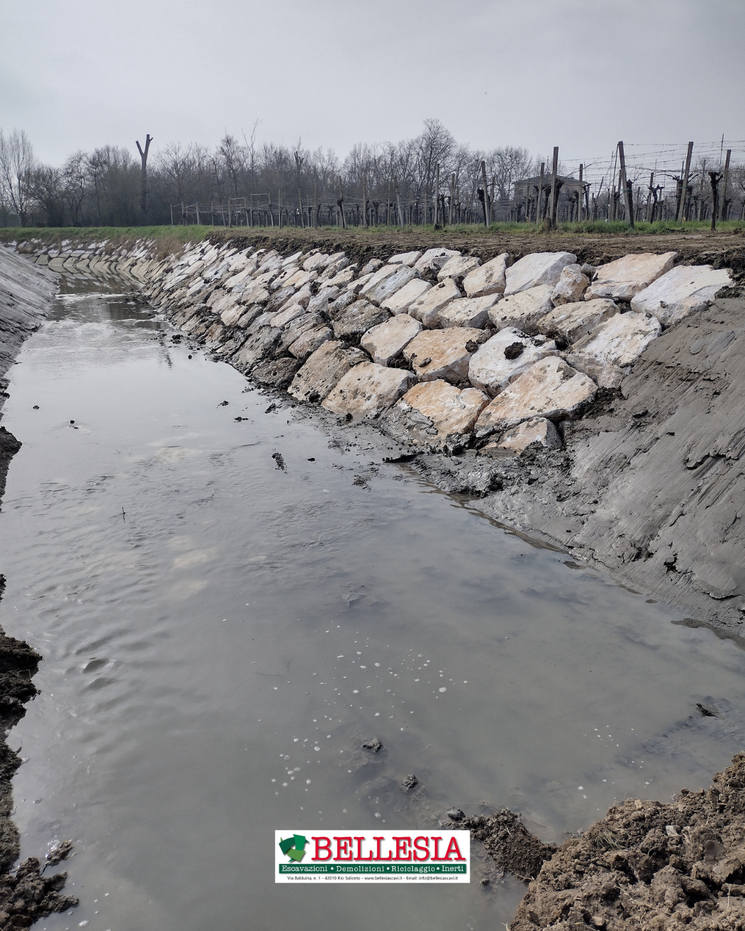 - Ripristino della sezione arginale: Recupero delle frane e risagomatura delle sponde mediante riporto e compattazione di materiale idoneo, restituendo al canale il profilo geometrico originale.