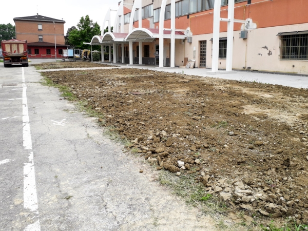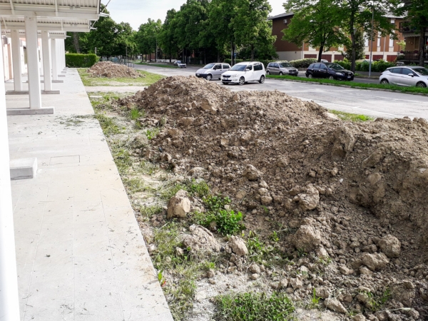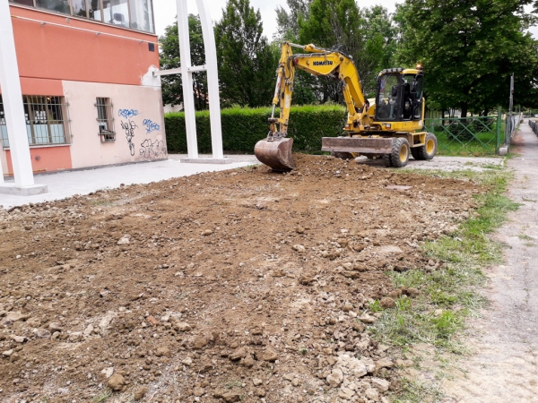 Il nostro contributo ha riguardato l’area esterna che, terminati gli interventi edilizi, abbiamo sgombrato da rottami e altri materiali di risulta. Tutta la terra intorno al fabbricato risultava ‘sporca’, abbiamo così provveduto alla scarifica (5 cm di profondità) e steso e livellato la nuova terra su tutta l’area, in preparazione del prato. L’intervento è durato una sola giornata.