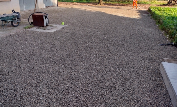 Posa e livellamento della ghiaia: la ghiaia utilizzata è la nostra ghiaia frantumata, scelta per le sue qualità antiscivolo e di stabilità. Un rullo ha poi compattato e livellato il terreno per ottenere una superficie uniforme.