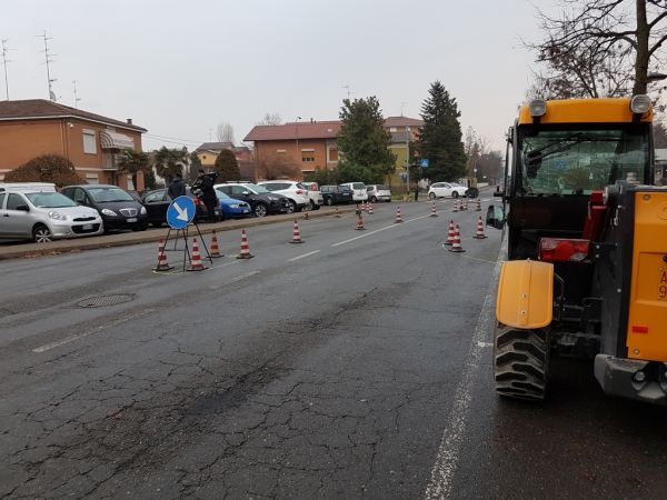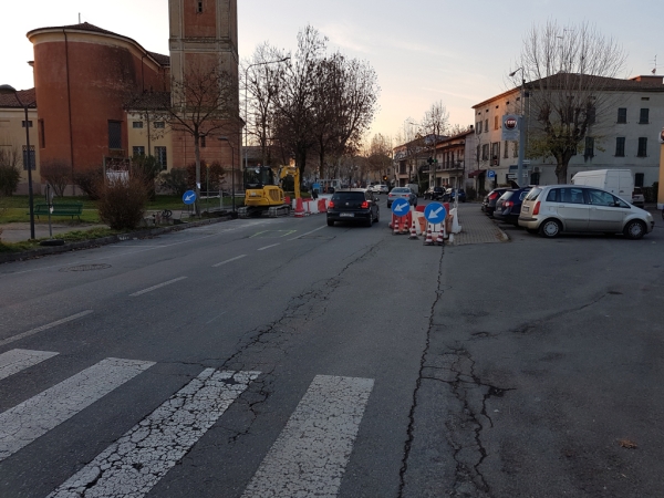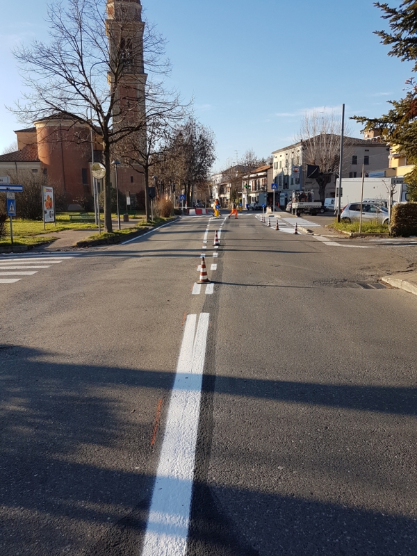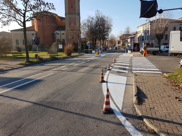 Rio Saliceto (RE): restringimento di carreggiata con isole pedonali e segnaletica stradale.