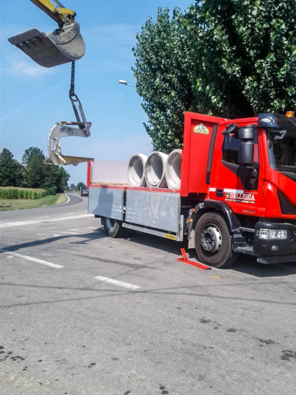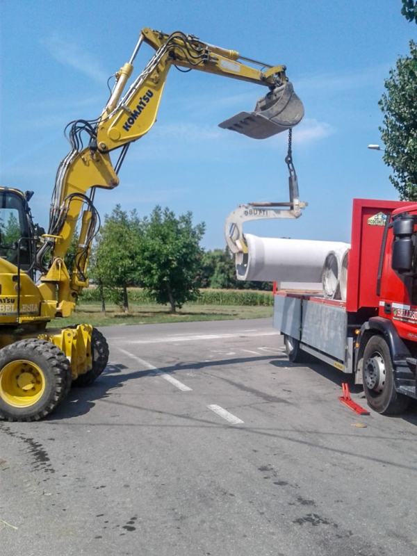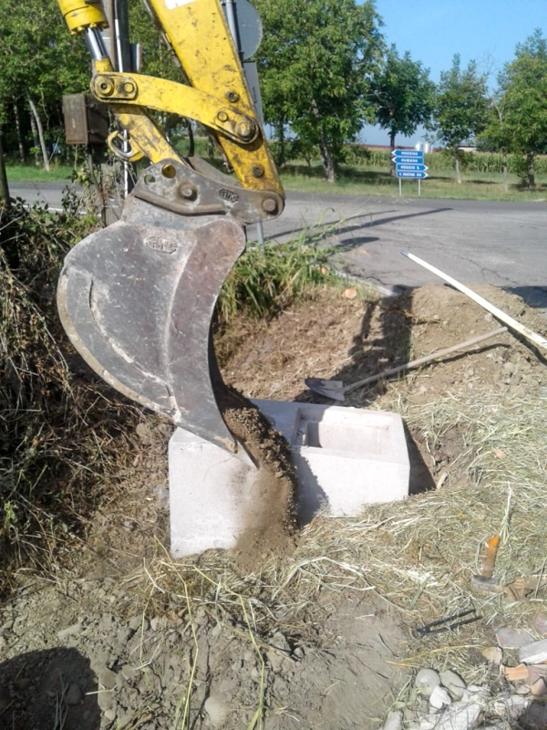 Dopo aver creato un by pass laterale per continuare a far defluire le acque, a lavori in corso, il letto è stato adattato con l’escavatore per accogliere i tubi autoportanti. Dopo averli posizionati con le forche, li abbiamo interrati insieme ai pozzetti d’ispezione e a un plinto per l’impianto elettrico e per il sostegno del lampione.