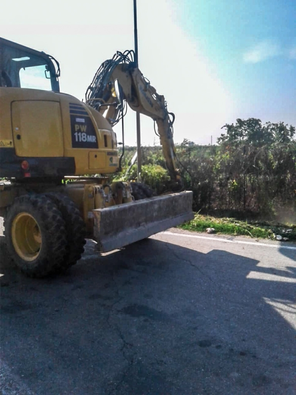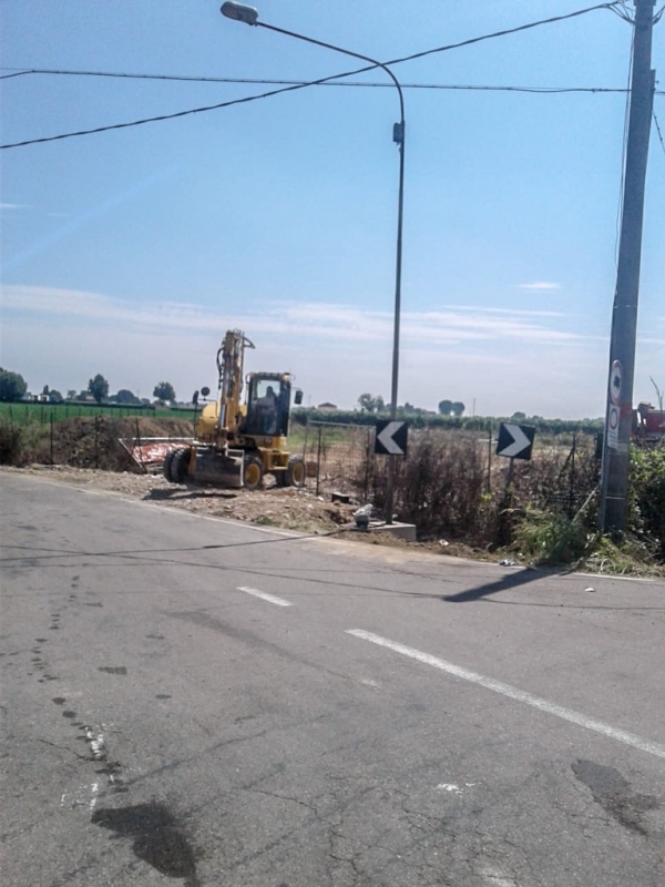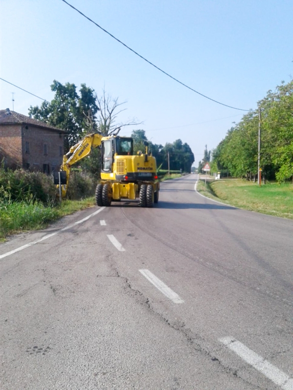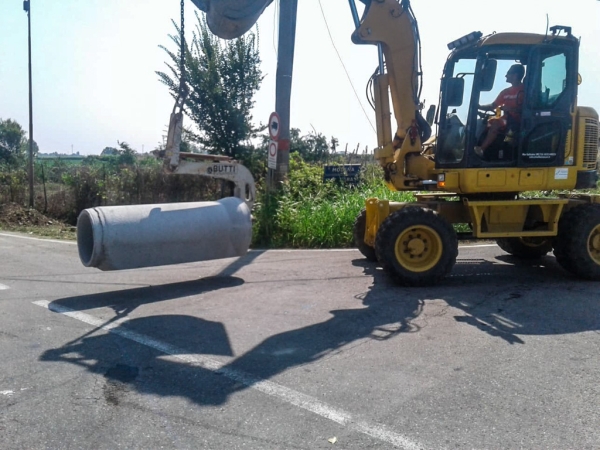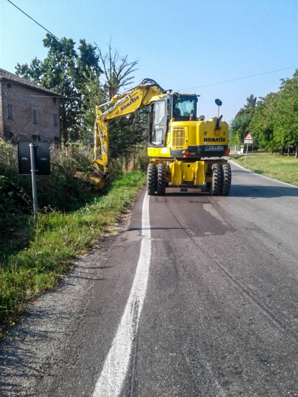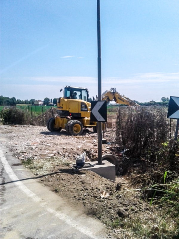 Prima di procedere al tombamento abbiamo pulito gli argini da arbusti, canneti, rovi e altra vegetazione incolta. Con la trincia abbiamo rasato entrambi i lati del fosso. Sfalci e potature sono stati raccolti con pinza bivalente e caricati sul rimorchio per il conferimento all’area ecologica.