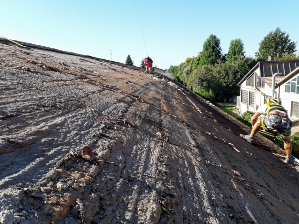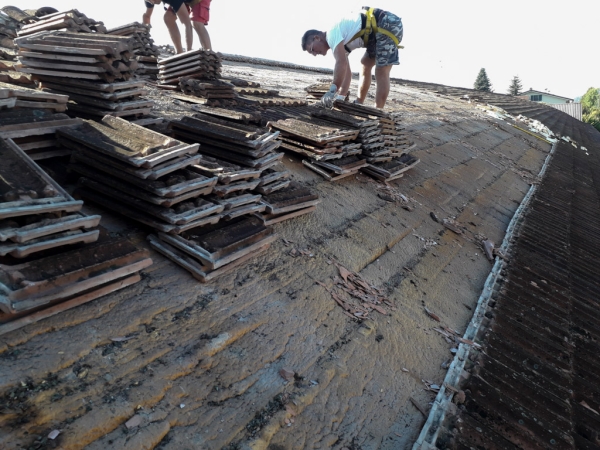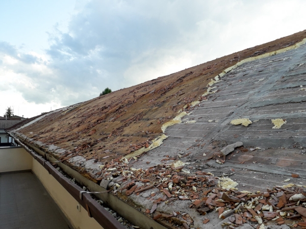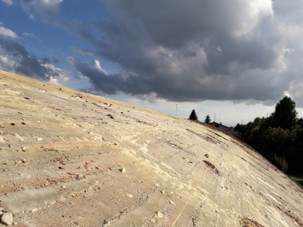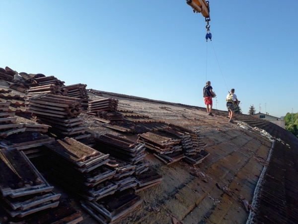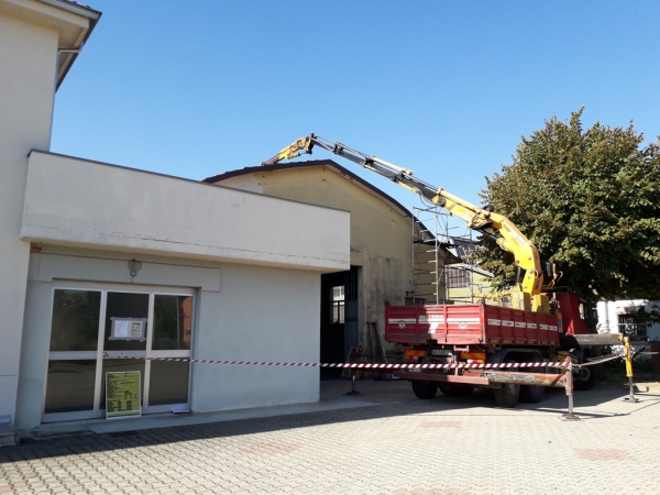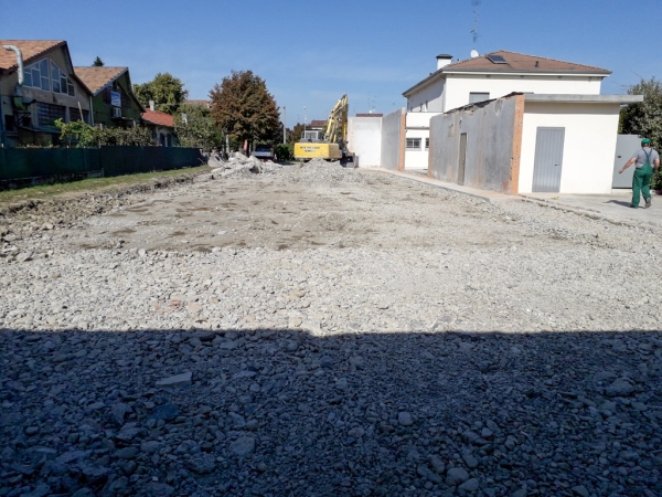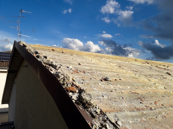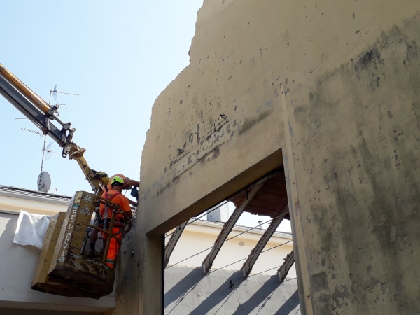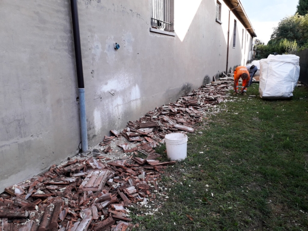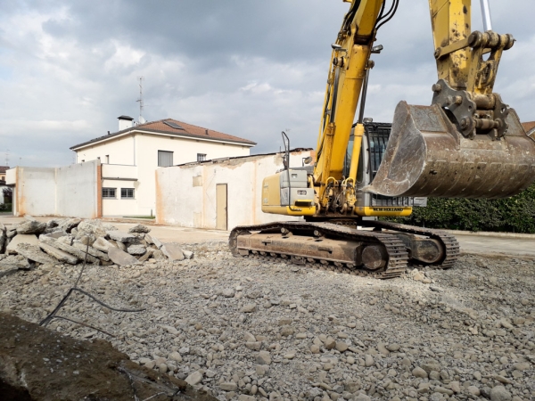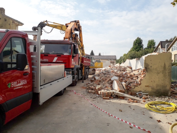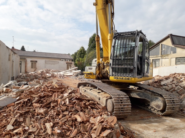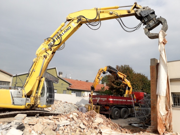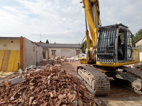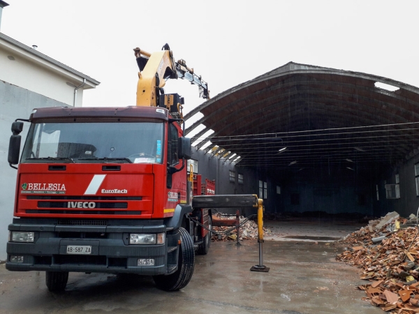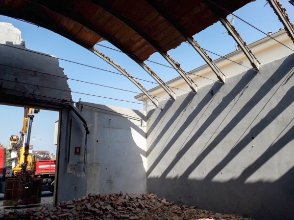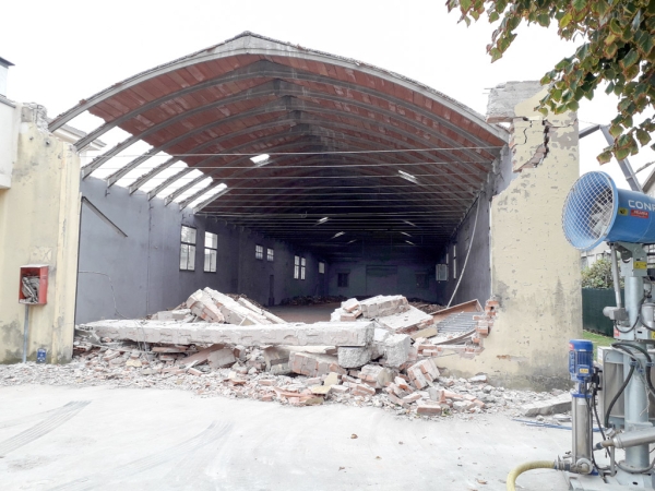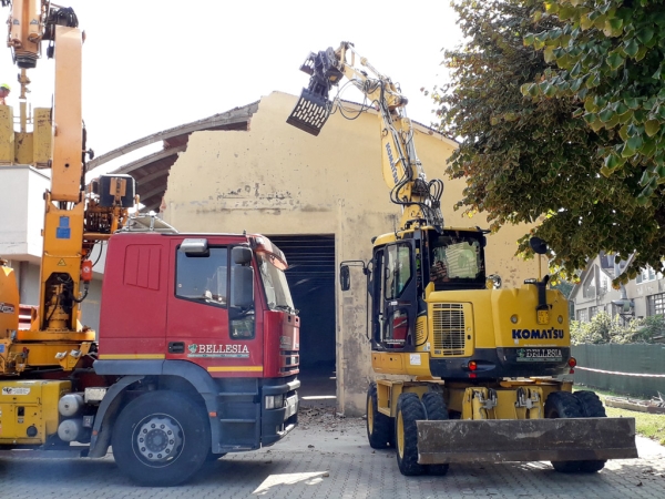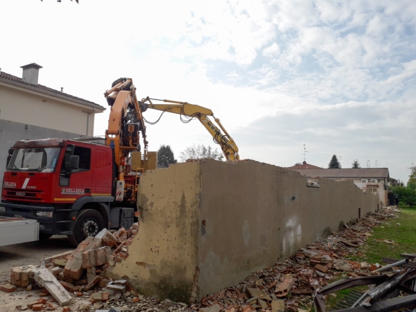 Partiti dalla copertura ad arco, abbiamo dapprima rimosso le tegole, poi lo strato termoisolante, le tavelle e le travi di metallo. Siamo passati ai muri perimetrali, alle fondazioni e infine alla pulizia del terreno. La maggiore criticità di questo cantiere è stata il taglio delle parti in muratura aderenti all’immobile a fianco, tuttora in uso, quindi da preservare. Le nostre cesoie hanno staccato pezzo dopo pezzo, con cautela, il muro laterale addossato all’altro edificio.