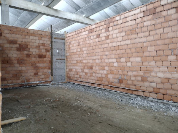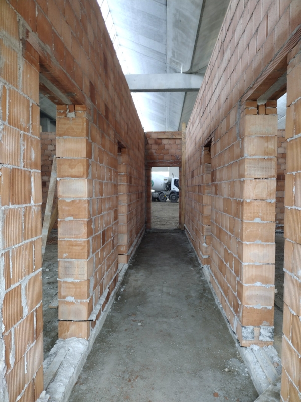 Costruzione delle murature interne del nuovo magazzino con blocchi forati in laterizio. Questa operazione risulterà utile alla compartimentazione degli spazi per la creazione di spogliatoi, servizi igienici e locale compressori. Le pareti sono state realizzate con attenzione alla solidità strutturale e alla durabilità, rispettando tutte le normative vigenti in materia di sicurezza.